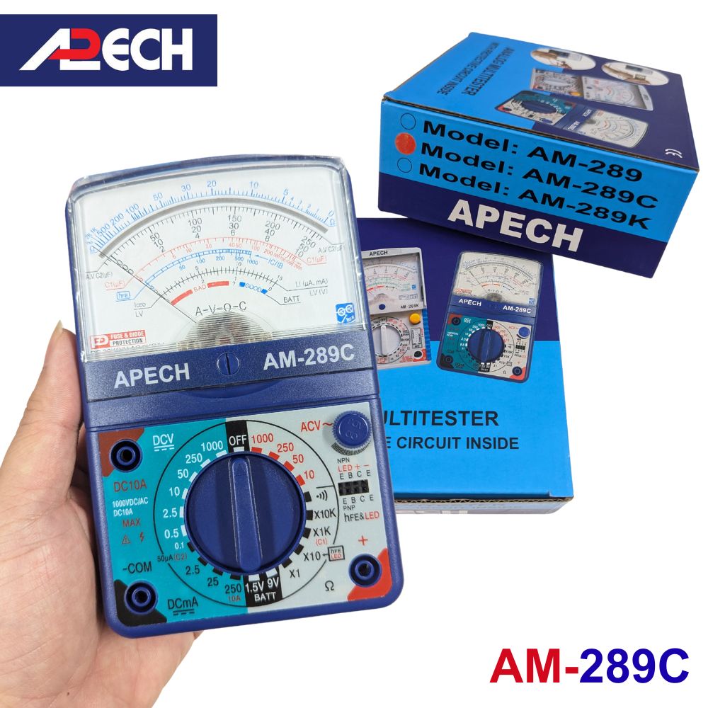Đồng hồ vạn năng APECH AM-289C là một thiết bị đo lường điện cầm tay thuộc dòng Đồng hồ vạn năng cơ (Analog Multimeter), hay còn gọi là đồng hồ VOM (Volt-Ohm-Milliammeter) sử dụng kim chỉ thị trên mặt đồng hồ để hiển thị kết quả chính xác.