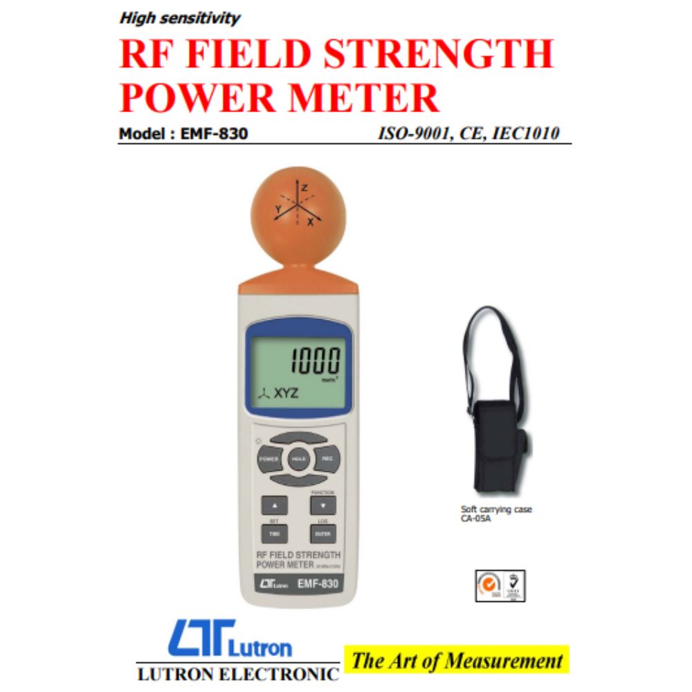 LUTRON EMF-830 là máy đo cường độ công suất trường tần số vô tuyến (RF Field Strength Power Meter) – một loại máy đo điện từ trường chuyên dụng cho dải tần số vô tuyến. Được thiết kế để đo lường chính xác cường độ của sóng điện từ trong dải tần số cao như xác định cường độ sóng phát ra từ các trạm phát sóng điện thoại và các ứng dụng không dây (bao gồm CW, TDMA, GSM, DECT), đo công suất từ các bộ chuyển đổi nguồn tần số cao, hỗ trợ dò tìm và cài đặt sóng cho mạng LAN không dây (wireless LAN), cũng như kiểm tra mức độ rò rỉ sóng từ lò vi sóng.