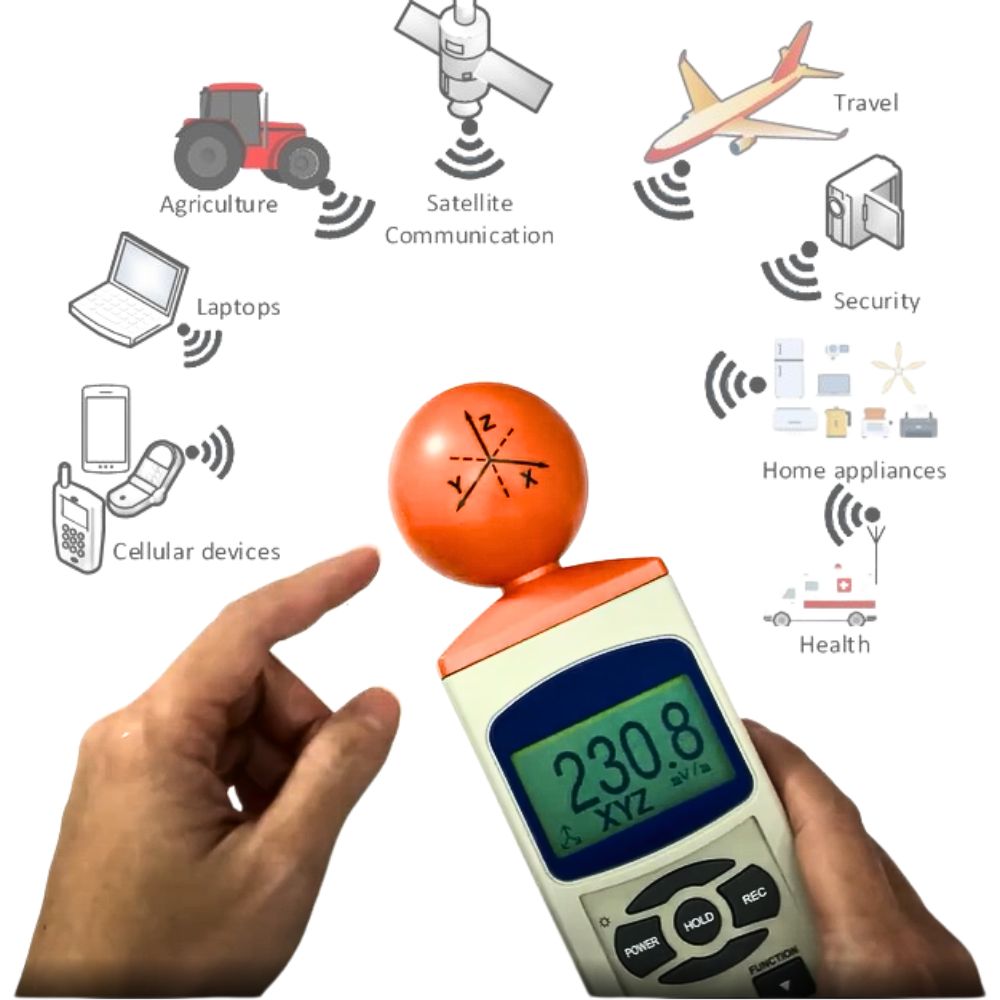 Thông qua các phép đo này, thiết bị đo điện từ trường cầm tay đóng vai trò thiết yếu trong việc đánh giá và đảm bảo an toàn môi trường phơi nhiễm trường điện từ (EMF) đối với sức khỏe con người, bằng cách cung cấp dữ liệu định lượng về cường độ sóng ở tần số vô tuyến (RF) – một thành phần cụ thể của phổ điện từ.