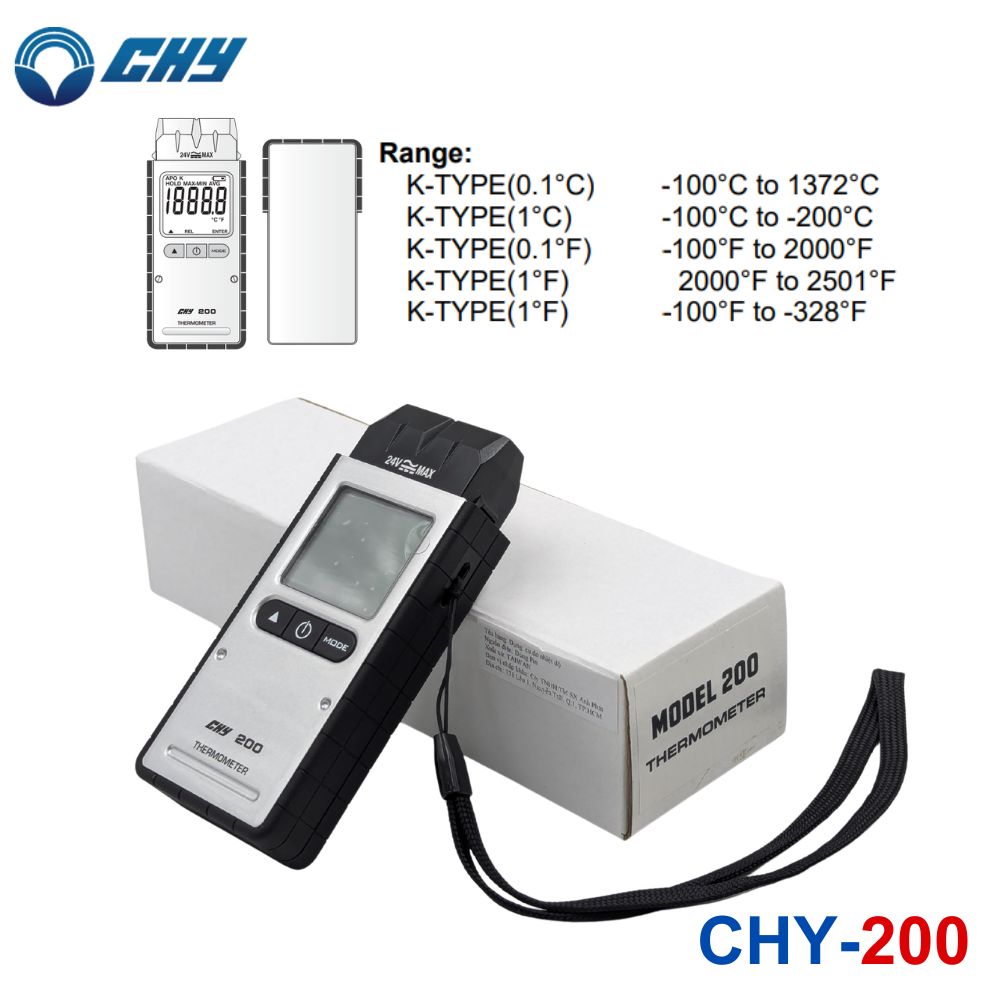 CHY 200 là máy đo nhiệt độ sử dụng cặp nhiệt điện loại K (K-type Thermometer) – loại nhiệt kế điện tử cầm tay nhỏ gọn được sản xuất bởi hãng CHY Firemate (Đài Loan).